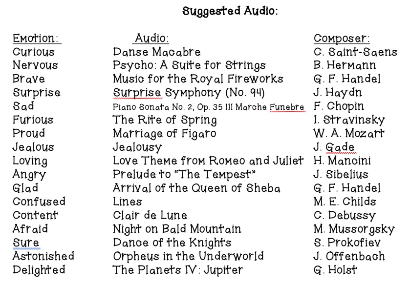 An additional self-awareness lesson for younger students uses the book, Happy, by Miles Van Hout. Happy is a book about feelings using illustration to show the labeled emotion. The illustrations are vibrant and colorful, and the illustrator chose color palettes that fit identified emotion, beautifully. This lesson is easily spread across several days as there are 17 emotions identified. The process is simple, play the audio selection for the emotion (ie: Content, Clair de Lune by Debussy), discuss what it means to feel the emotion, and how the music fits the emotion, you can close by asking the students, “when do you feel ___?”