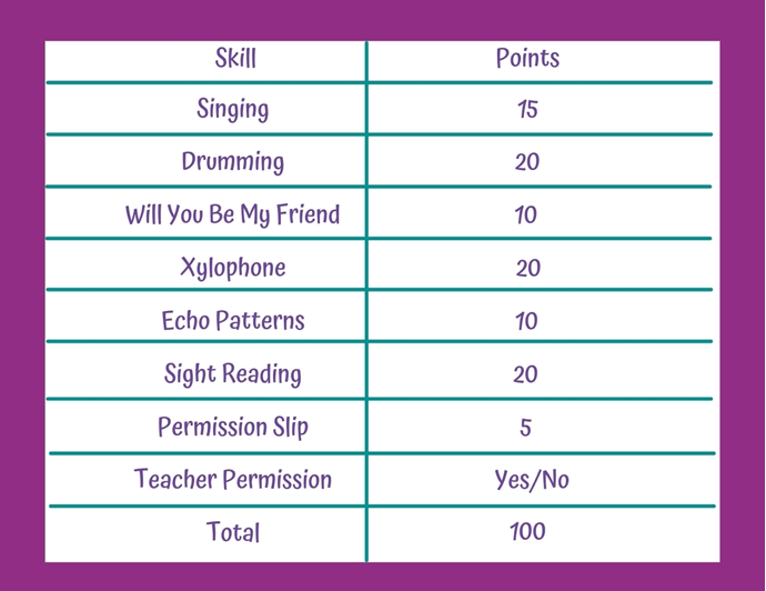 I give the students a packet with the music and links to videos (on my YouTube channel) to watch to prepare for their auditions. On audition day, I have the instruments set up and ready to go with copies of the music, on music stands (or they can use their own) and my iPad set up to record their audition. I record for two reasons, one, for me and my ADHD so I don’t miss anything, two, in case a parent questions their child’s ranking and acceptance. I can show the video and discuss what the weaknesses were. I listen to their audition, rate their score, and select the top 30 students. I do take into consideration their grade level to a small extent. If number 30 is a third grader and 31 a fifth grader and their scores are neck and neck, I may choose the fifth grader, since I want that fifth grader hooked on music before leaving for middle school. I do not always consider their grade level, but on rare occasions I do. I have a different scoring system for each grade level and adapt the rubric to reflect their grade level and skill level.